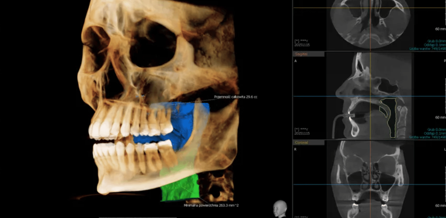W naszej pracowni RTG stomatologicznego w Gdyni wykonujemy tomografię CBCT 3D, która jest niezbędna przy planowaniu zabiegów implantologicznych, ocenie jakości i ilości kości, diagnostyce zmian patologicznych oraz przygotowaniu do zabiegów chirurgicznych i ortodontycznych.